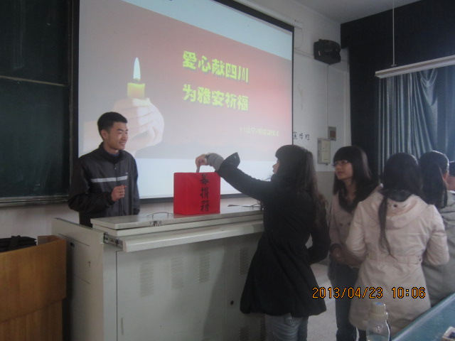 4月23日上午10点,11法学二班在2020203教室举办题为“爱心献四川 为雅安祈福”的现场募捐活动。