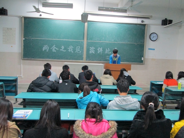 为响应学院团委号召,宣传两会知识。12行管于3月27日晚7点在2040204教室举办“两会之我见”演讲比赛。辅导员严宏出席并担任评委,本次比赛由团支书张娴主持。