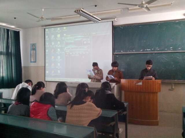 为响应团委号召,增强同学们对党和国家的热爱。3月31日下午三点,12行管在2010604教室举行“十八大美丽中国”主题配乐朗诵比赛。本次比赛由组织委员叶成臣主持。