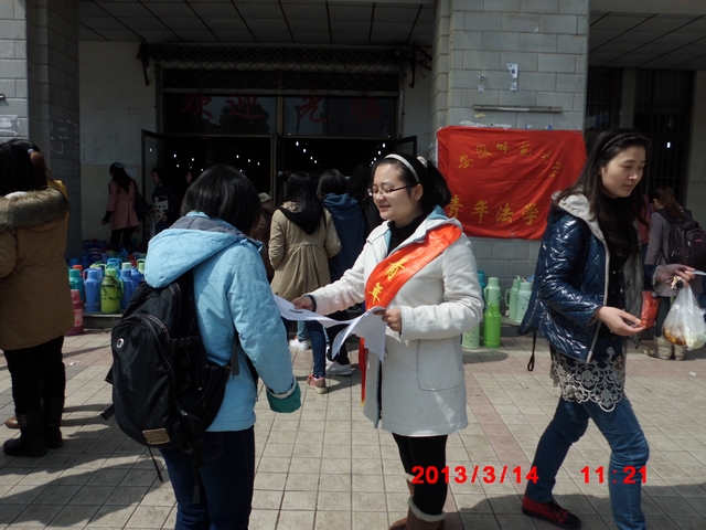 为了进一步发挥法学知识作用,提高同学们的消费维权意识,青年法学社于3月15日中午在一食堂门口举行“校园普法”活动,众多青年法学社的会员参与其中。