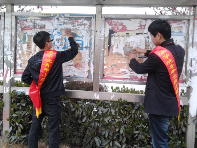 本次活动的主要内容是清理花津河和清理校园小广告,两个活动同时进行。活动现场,每个员工志愿者都表现的十分积极。宣传栏旁,同学们用小铲子和小刀仔细清理玻璃上的小广告;花津河边,同学们用竹竿打捞河中悬浮物。大家捡拾地上的垃圾,铲除随意张贴的小广告,用自己的实际行动号召大家创建美丽校园。