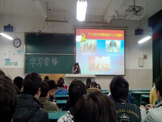 新时代的脚步带来的不仅是科技的进步,还有精神的追求。第一团小组组长在一段关于雷锋生平事迹的宣讲后,揭开了班会的主题。此次班会分为“雷锋与我相伴行”、“我与雷锋找差距”、“雷锋行、从小事做起”三个部分。团小组成员分别就这三个题目进行了理论与实践的讨论,他们强调单单书本上的雷锋是不够的,重点是实践中的雷锋。最后全体同学决定通过“立足岗位”、“立足学习”两个方面践行雷锋精神。
