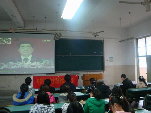 为积极学习十八大重要理论,11月10日下午3点中国特色社会主义理论体系研究会各部部长和理事在2010504教室共同观看学习了中国共产党第十八次全国代表大会开幕式录像,认真学习胡锦涛同志讲话精神。同学们认真聆听了胡锦涛的讲话,并阐述了自我感受。