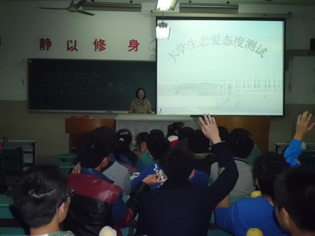 在侯伟伟的主持下,班会伴着一首轻快的歌谣开始了。同学们观看了一段名为“非诚勿扰”的视频,通过人们对于恋爱的不同的看法来展现现代的爱情观。第三团小组的组员为大家介绍了爱情的概念、老员工恋爱特点以及恋爱心理,为大家展示对恋爱更深层次的剖析;同时,他们亦注重恋爱的积极影响,希望同学们能通过这次班会,树立正确的恋爱观。随后,大家欣赏了“初恋这件小事”“那些年我们追过的女孩”等视频,透过别人的故事看到理想与现实的差距,而最后的心理测试则让同学们真正了解其实恋爱是一种抵达,是一种经验,它更注重积淀,而不是累赘。
