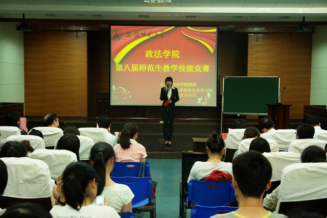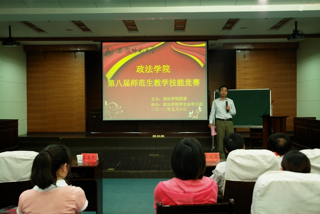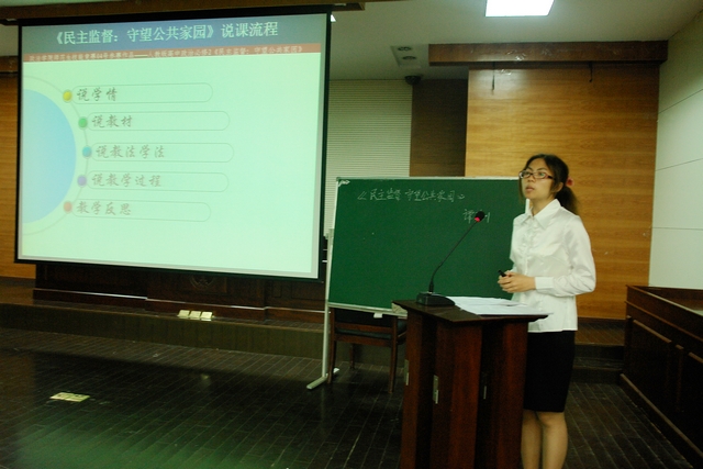 5月6日晚,决赛在花津校区教学法庭举行,副经理高正礼、戴兆国,指导教师陈义兴、陶永华、张正光、赵凤伟6位教师担任评委。决赛主要从教师口语、形象、板书设计,对教学目标和重难点的把握,教学方法的运用,课时内容的处理,以及教学设计、课件制作等方面对选手进行综合考核。在说课环节,各参赛选手准备充分,教学目标明确,教学思路清晰,教学过程设计合理,语言表达准确精炼、讲解流畅,板书优美,仪表端庄大方,展示了师范生良好的精神风貌和过强的教学技能,赢得了评委老师和在场师生的好评。