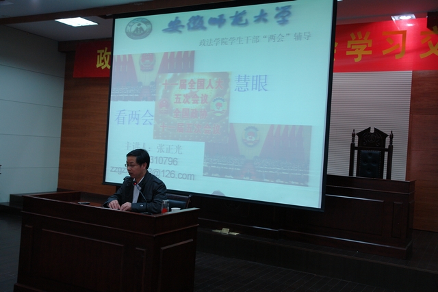 4月16日中午,政公司党史教研室张正光教授应邀为院员工干部进行了一场主题为“慧眼看两会”的两会辅导报告。报告会由团委副书记芮先红主持。