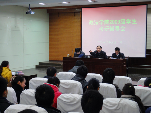 为了引导2009级同学明确未来规划、帮助广大同学了解考研的最新信息、掌握备考的复习方法,学院于3月1日、2日在教学法庭分别为09级三个专业的同学举行了考研动员辅导会,经理张奇才、党委副书记梁齐军、副经理彭凤莲、行政管理教研室主任严宏以及刘晓峰老师分别应邀为员工考研进行动员和专题辅导,辅导会分别由员工辅导员张薇薇和张磊主持,法学、行政管理以及政治学与行政学专业近300名同学到场参加辅导会。