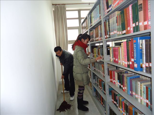 上午9时许,大家来到院资料室,由于之前已经做好分工——男同学主要是扫地、拖地,女同学则是擦桌子、门窗及一些办公用品,所以他们的打扫工作很快就完成了。然后大家又集中精力整理资料室的书籍,让其摆放整齐和有序,以方便同学们更好的查阅。两个小时的劳动,分工合作,不怕脏不怕累,虽然天气很冷、风很大、水很凉,但大家都忙得热火朝天。