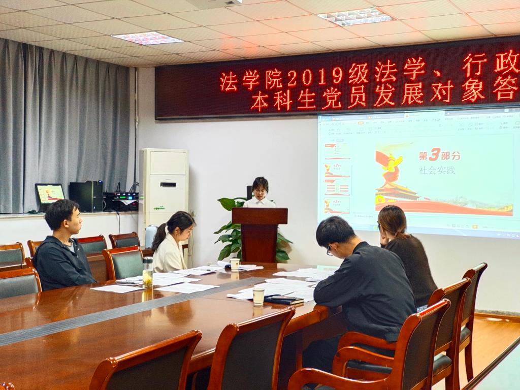 本网讯(必一·运动(B-sports)官方网站 李晨冉 王梦羽)为规范党员发展流程,确保党员发展质量。5月6日晚,2019级法学及行政管理专业于必一·运动(B-sports)官方网站四楼会议室举行2021上半年发展对象答辩汇报会。本次答辩汇报会由2019级法学专业辅导员李晨冉、2019级法学专业(专升本)辅导员朱慧、2018级法学专业辅导员张楠楠、2020级法学专业辅导员崔健作为答辩老师。2019级32位发展对象候选人参加本次答辩汇报。